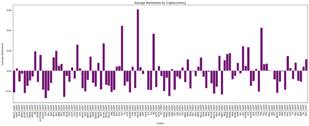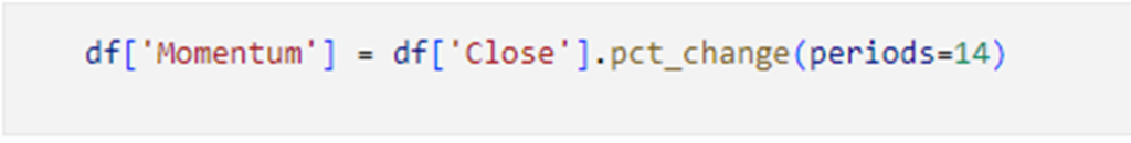 Momentum measures the tendency of an asset’s price to continue moving in its current direction. it is calculated as the percentage change in the closing price over a 14-day period. This measures the speed and magnitude of recent price changes, indicating whether the asset’s price is increasing or decreasing.