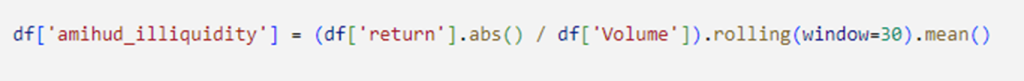Amihud Illiquidity This measure captures the price impact per unit of trading volume. It is the average of the absolute return divided by volume over 30 days. Higher values indicate less liquidity, as small trades cause larger price changes.