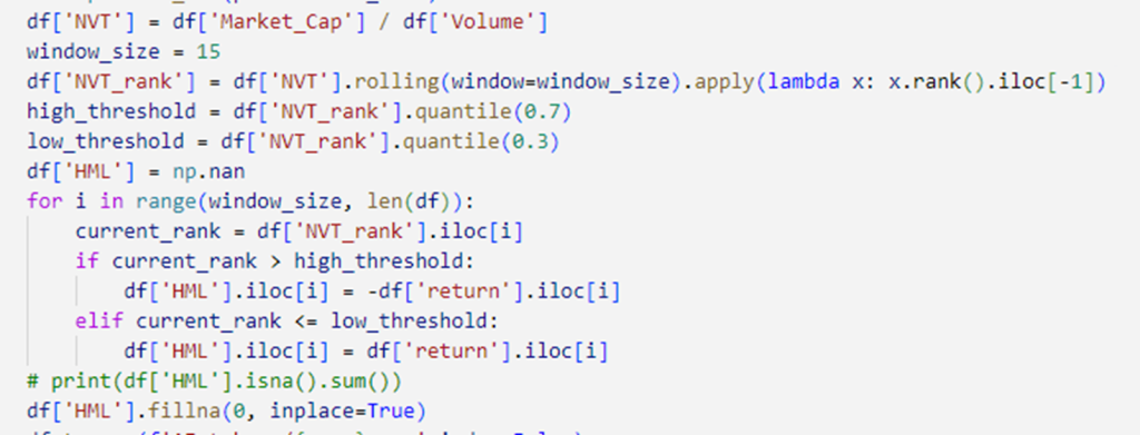 The HML (High Minus Low) factor is constructed by first calculating the NVT (Network Value to Transactions) ratio, which is the market cap divided by volume. This ratio is ranked over a rolling window to assess relative value. High and low thresholds are set using quantiles to identify overvalued and undervalued assets. The HML factor assigns negative returns to overvalued assets (above the high threshold) and positive returns to undervalued assets (below the low threshold). Any missing values are filled with zero to ensure completeness. This process captures the value premium by differentiating between high and low NVT-ranked assets.