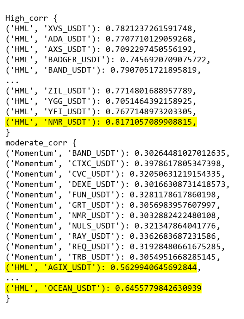 We examined the correlation of each factors with return for each crypto-currency. We categorized the correlation into three categories : low, moderate and high. based on the results as you can see below, HML is highly correlated with return for some tokens.