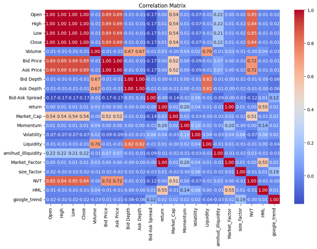 - Google Trend: Shows weak correlations with most factors, indicating it might not be a strong predictor of any particular aspect of the market dynamics.
