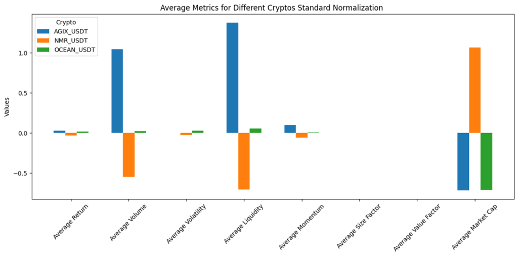 - NMR (Numerai) stands out with a notably high value factor, though it shows lower performance in volume and liquidity. This might indicate it’s viewed as more of a value investment.