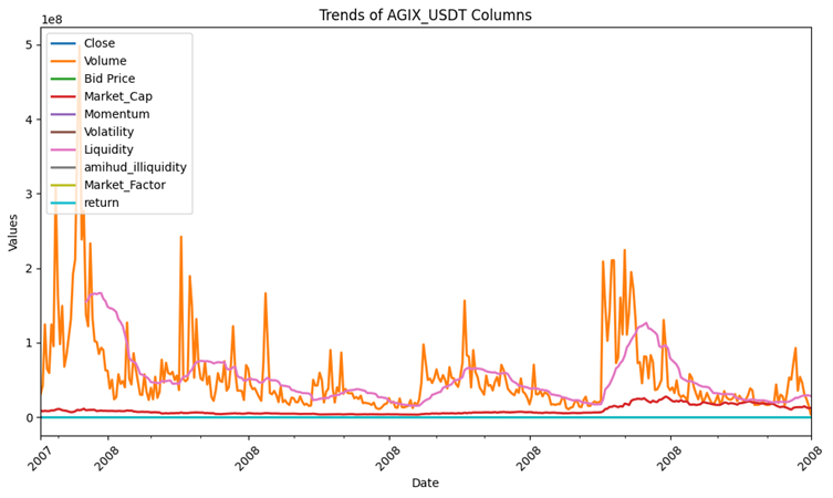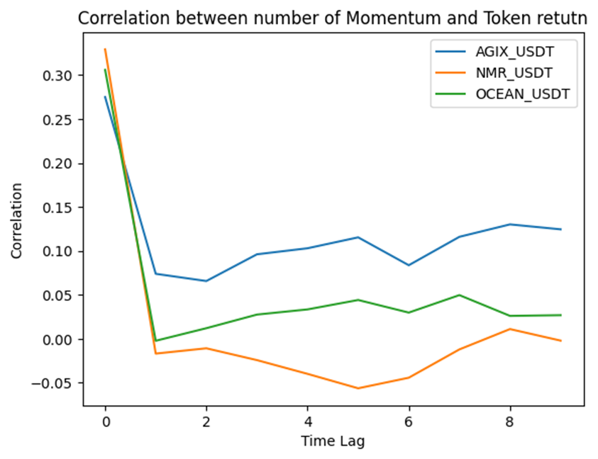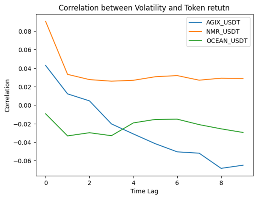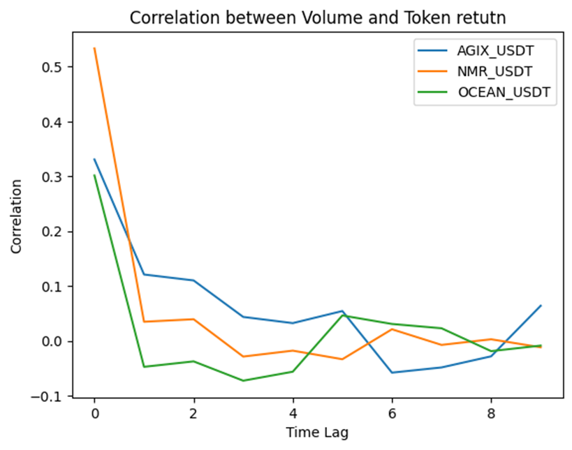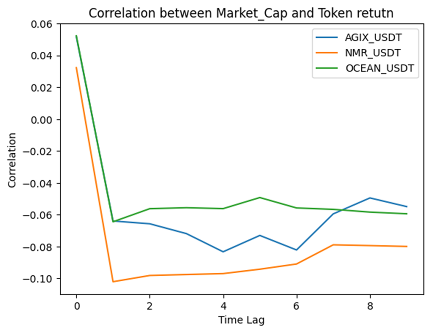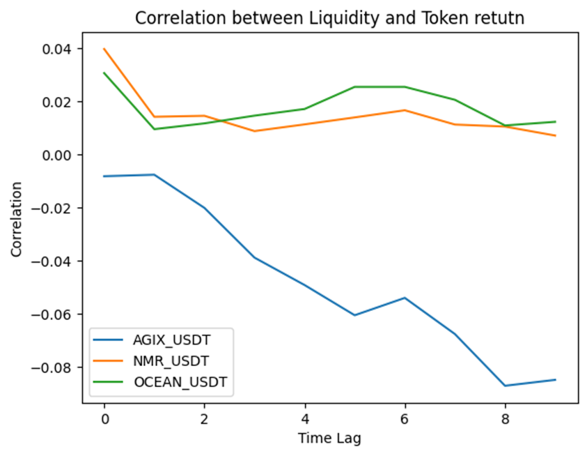 These images illustrate that in lag =0 the correlation is maximized for all factors (except of AGIX- return and Liquidity which is maximized in lag 1 ) which implies that these factors are significant drivers of token returns in the short-term (without any time delay). This could suggest that any fluctuations in these factors immediately influence the returns of these cryptocurrencies. In practical terms, the prices react to the factors on the same day or instantaneously, showing a strong relationship between the two at this specific point in time.