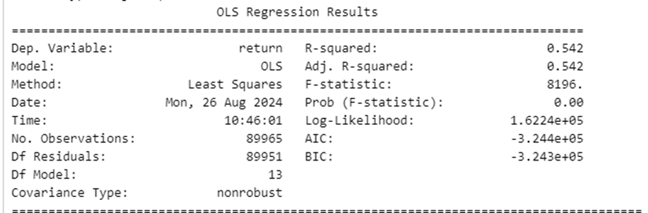 The OLS regression analysis have been performed on a combined dataset of all 128 cryptos which are concatenated alongside each other. with 1000 sample for each crypto our combine dataset has 128000 samples with economic and market factors as features. The datasets in this model containing economic factors without google trend since their join was empty without overlap in time. This model explores what factors influence crypto returns. Based on R-squared metric, the model can explain approximately 54.2% of the variability in returns which indicated that these factors couldn’t well predict the return.