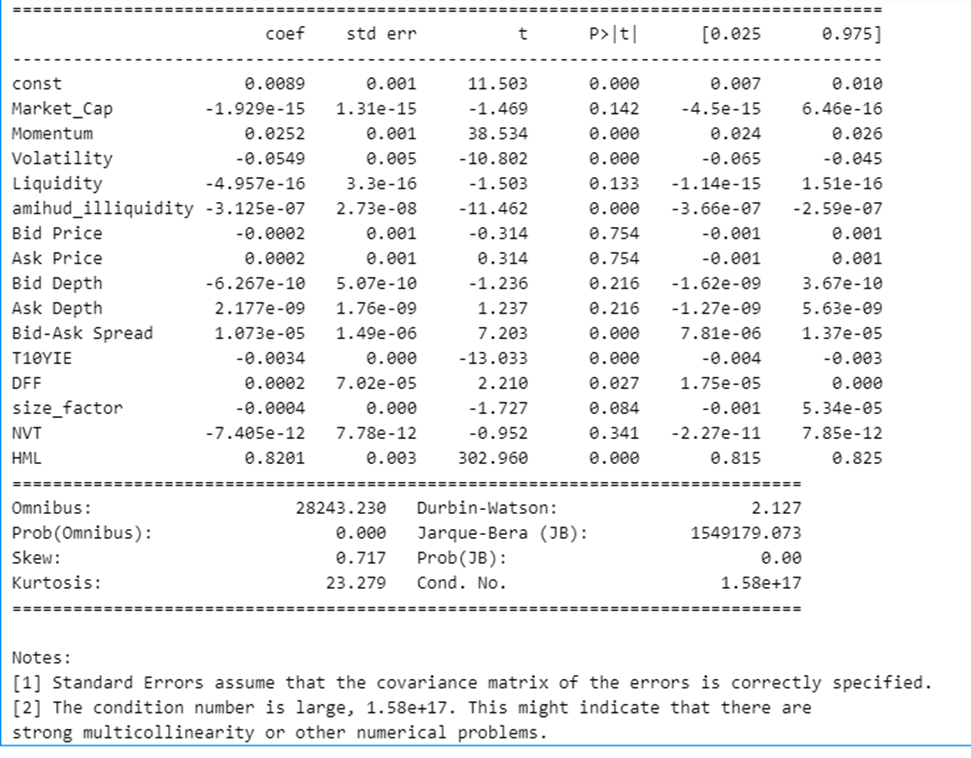Key factors include momentum, with a significant positive coefficient (0.0517) and a p-value of 0.000, indicating a strong relationship with returns. The HML factor also shows a significant positive effect (0.7148) with a p-value of 0.000. Other factors like market cap, volatility, liquidity, and others have high p-values, suggesting they are not statistically significant in this model.