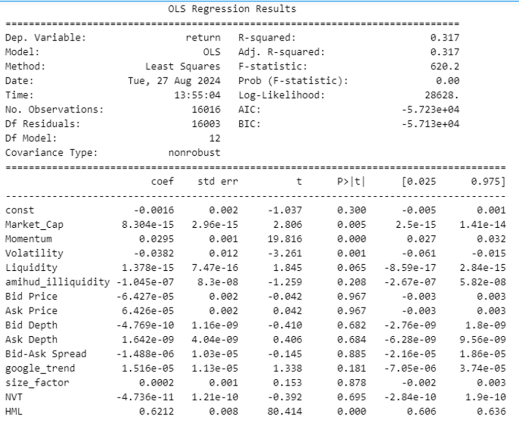 One more time we applied the OLS regression analysis on a combined dataset of all 128 cryptos, but this time only with google trends and market factors as features (without economic factors). The model shows that about 31.7% of the changes in returns can be explained by the model’s factors. As before, the higher momentum (with low impact) and HML (high minus low) values are linked to increased returns, while higher volatility (with low impact) tends to decrease returns. The model is statistically significant overall, but indicates that google trends do not significantly affect returns.