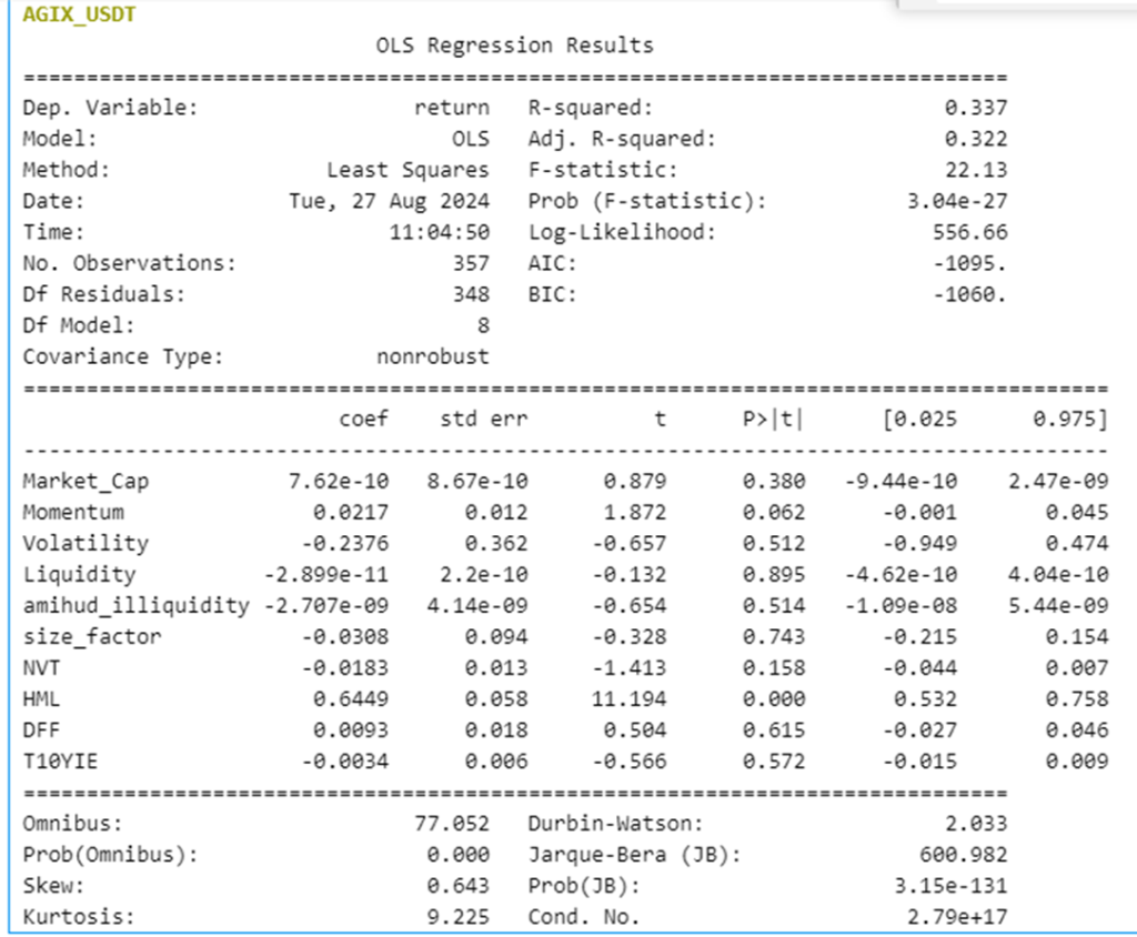 the model explains about 33.7% of the changes in returns, which means it captures some, but not all, of the factors affecting AGIX’s performance. The same as before the most impactful feature is HML with Coefficient: 0.6449 , t-statistic: 11.194 and P-value: 0.000 (highly significant). This is by far the most statistically significant variable and has the largest coefficient, suggesting it has the strongest positive impact on returns. The second most notable factor is also Momentum which shows a weak positive relationship with returns with Coefficient: 0.0217, t-statistic: 1.872 and P-value: 0.062 (marginally significant at 10% level). The rest of the features show little to no significant impact.