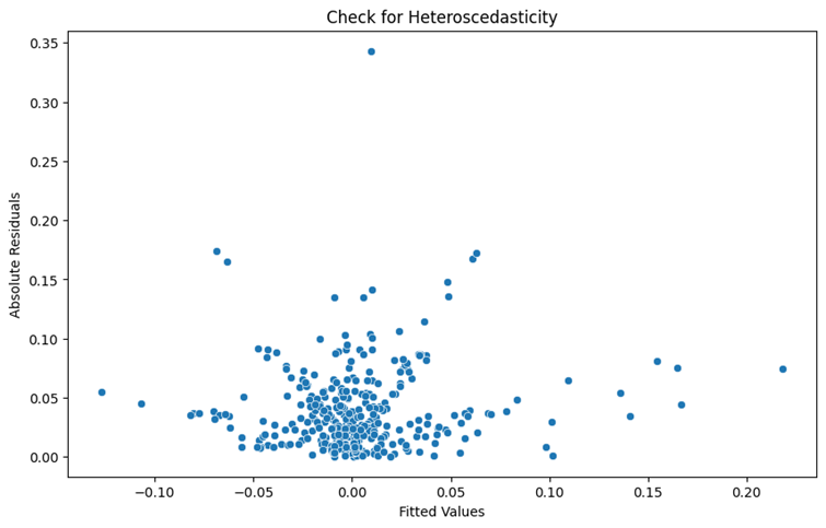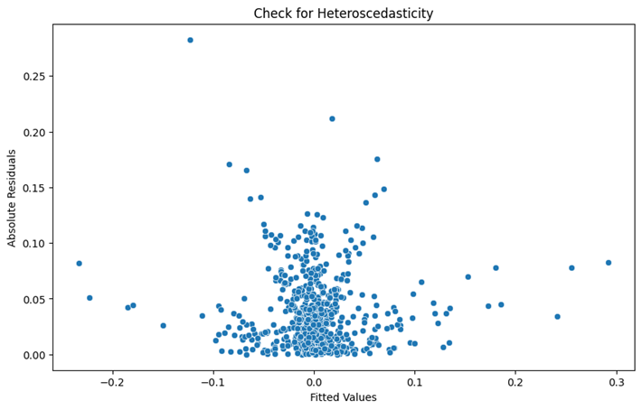 - Homoscedasticity: The points in Heteroscedasticity plot appear to be randomly scattered, though there might be some clustering around the 0 mark. This suggests no clear heteroscedasticity.
