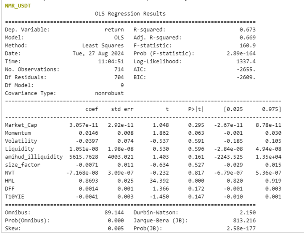 We also run OLS model on each of three AI token with 1000 samples : SingularityNet (AGIX_USDT) , Ocean Protocol (OCEAN_USDT) and NumerAI (NMR_USDT)