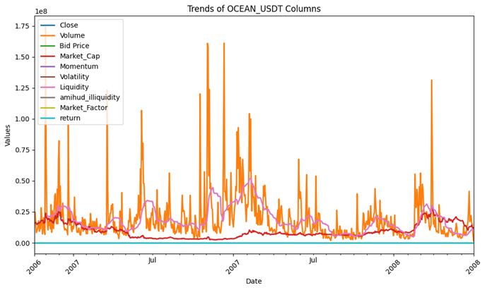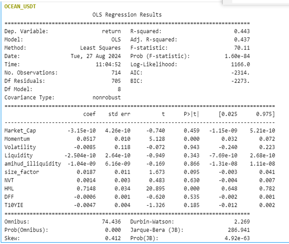 The OLS regression results on Ocean Protocol (OCEAN_USDT) show an R-squared value of 0.443, indicating that approximately 44.3% of the variability in returns is explained by the model. The adjusted R-squared is slightly lower at 0.437, suggesting a reasonable fit but leaving room for other factors or complexities not captured by this model.