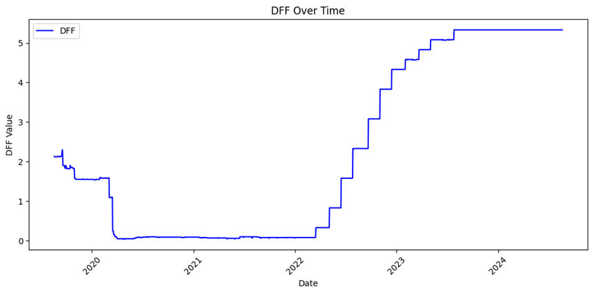 - Volatility: Has a weak negative correlation, indicating that higher DFF might slightly decrease volatility.